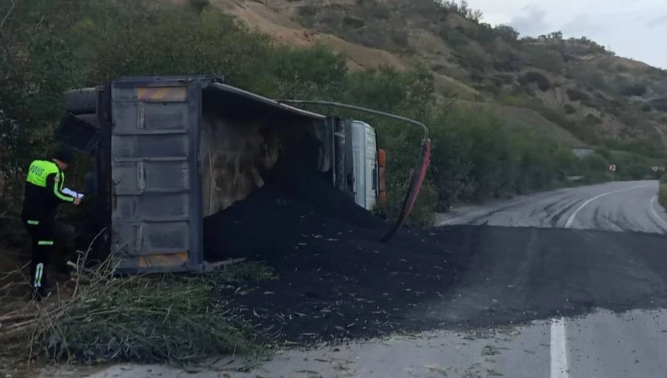 Asfalt yüklü kamyon devrildi