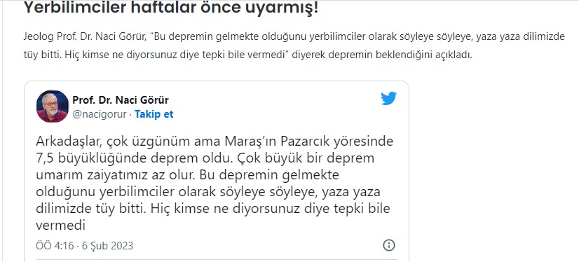Türkiye‘de Kahramanmaraş ve Gaziantep‘te meydana gelen 7.4 ve 6.4 şiddetlerindeki depremlerin ardından Jeolog (Yer Bilimci) Prof. Dr. Naci Görür‘ün o…