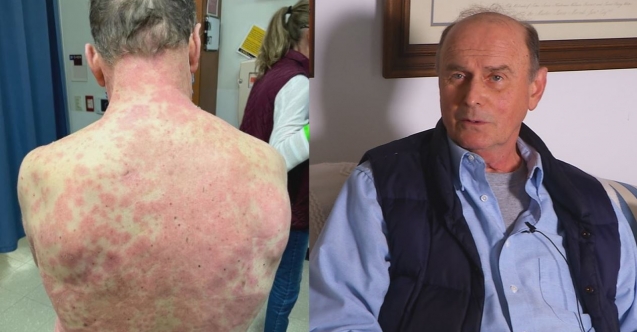 ABD’de Johnson&Johnson’ın Kovid-19’a karşı geliştirdiği tek dozluk aşısını olan Richard Terrell’in yaşadığı yan etki nedeniyle vücudunun büyük bir bölümünde kızarıklık…