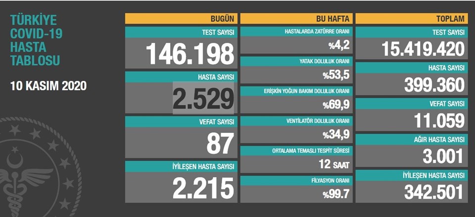 Türkiye Sağlık Bakanı Fahrettin Koca 10 Kasım 2020 günlük corona virüs tablosunu açıkladı. Türkiye’de son 24 saatte 2 bin 529…
