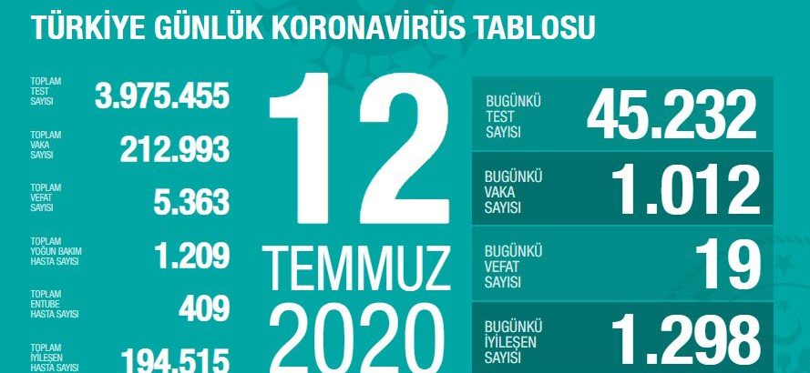 Türkiye’de son 24 saatte (10 Temmuz 2020) 1003 kişiye Covid-19 tanısı konuldu, 23 kişi hayatını kaybetti, toplam vaka sayısı 210…