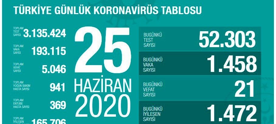 Türkiye Sağlık Bakanı Fahrettin Koca 28 Haziran 2020 günlük corona virüs tablosunu açıkladı. Corona virüsten son 24 saatte 15 kişi…