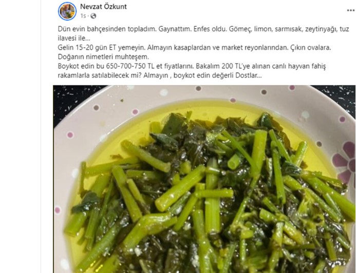 Toplumcu Demokrasi Partisi (TDP) Genel Başkan Yardımcısı Nevzat Özkunt, yurttaşı fahiş et fiyatlarını protesto etmek amaçlı 15-20 boyunca “et almamaya” davet ederek, doğayı işaret…