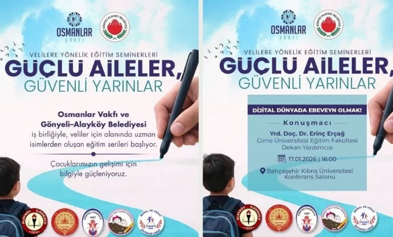 Osmanlar Vakfı ile Gönyeli–Alayköy Belediyesi iş birliğinde düzenlenen ve alanında uzman akademisyenlerin katılacağı velilere yönelik eğitim seminerlerinin ilki, 17 Ocak Cumartesi günü Bahçeşehir Kıbrıs Üniversitesi’nde “Dijital dünyada ebeveyn olmak” başlığıyla gerçekleştirilecek.