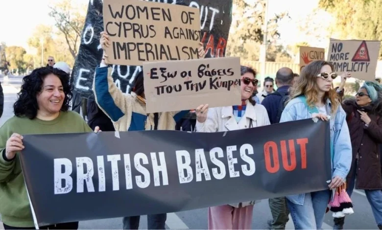 Eylemciler, adadaki yabancı askeri varlığın Kıbrıs’ı bölgesel çatışmaların hedefi haline getirdiğini savunarak İngiliz üslerinin kapatılmasını ve ülkenin askeri operasyonlarda kullanılmamasını talep etti.